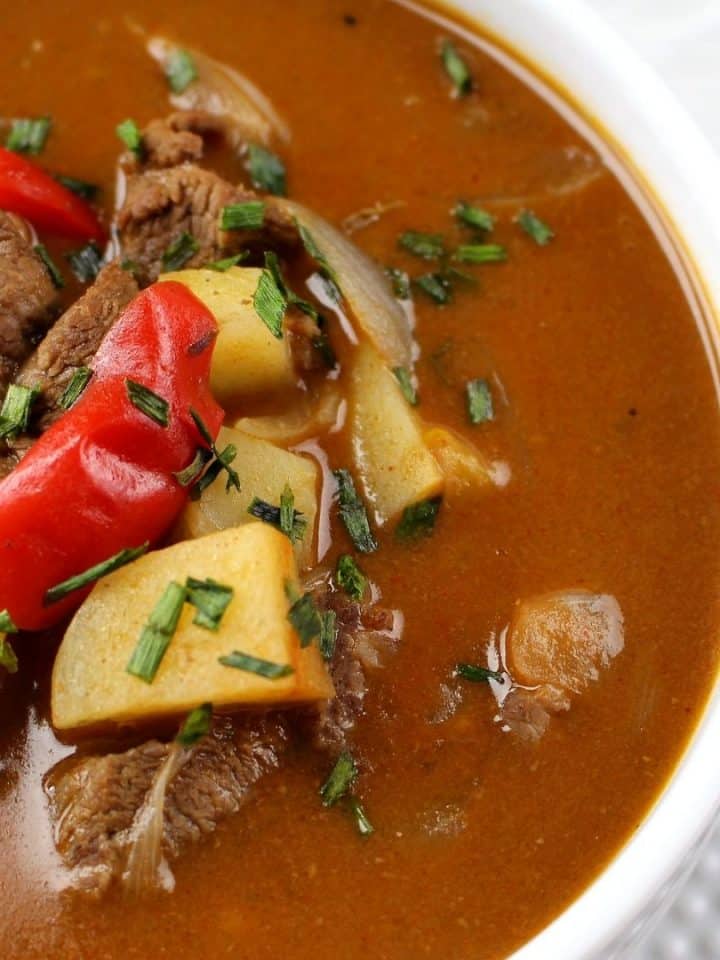 Deze hartverwarmende soep combineert mals rundvlees met kruidige paprika en aardappelen in een rijke bouillon. Een perfect gerecht voor koude dagen.