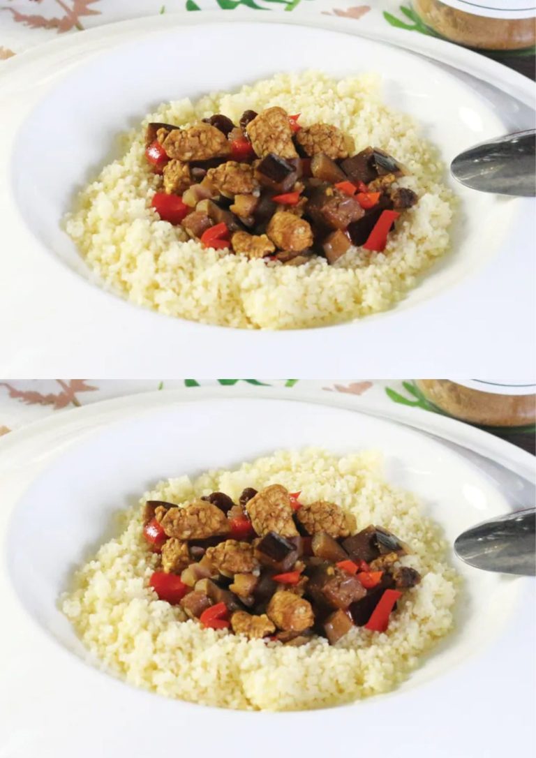 1. Couscous Lossen: Voeg een theelepel olie toe aan de couscous en maak deze los met een vork.