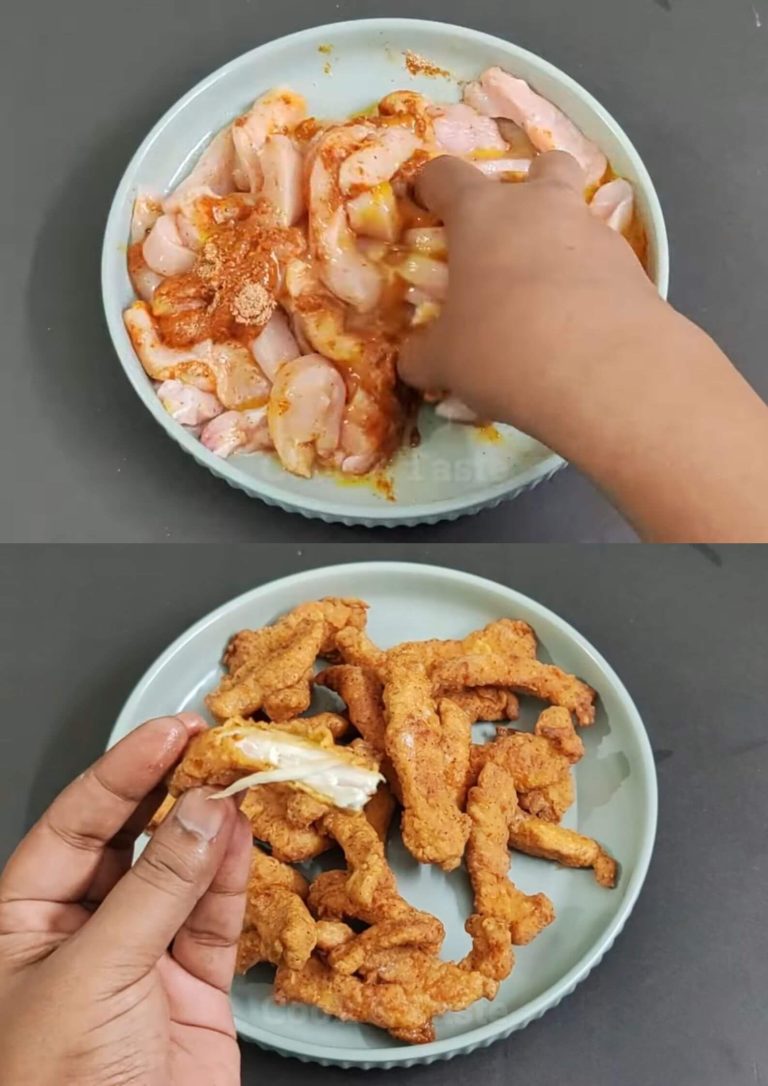 - Paneer de kip: Haal de gekruide kipstukjes eerst door de all-purpose bloem, schud het overtollige bloem eraf, en dompel ze vervolgens in de geklopte eieren. Zorg ervoor dat de kip goed bedekt is met het ei.