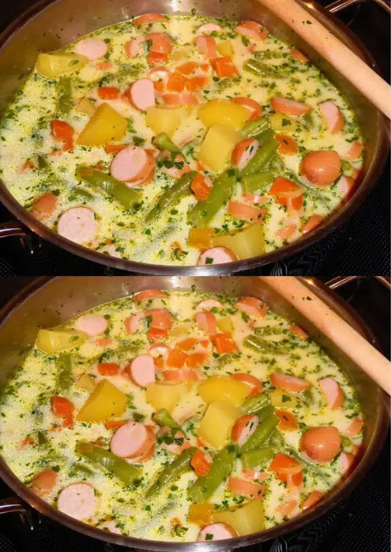 2. Voeg de Weense worstjes toe aan de soep en verwarm deze goed door.
