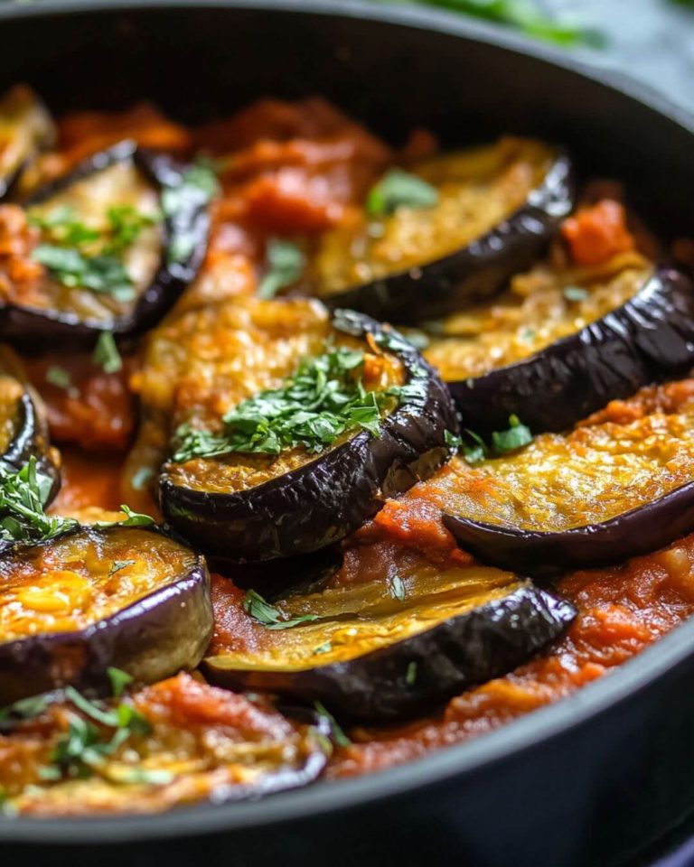 Deze gestoofde aubergines in tomatensaus zijn een perfecte combinatie van rijke smaken en gezonde ingrediënten. Dit gerecht is niet alleen voedzaam, maar ook veelzijdig, perfect als hoofdgerecht of als bijgerecht. Met sappige aubergines, een aromatische tomatensaus en een vleugje kruiden, is dit een maaltijd die je smaakpapillen zeker zal verrassen. Ideaal voor zowel doordeweekse diners als speciale gelegenheden!