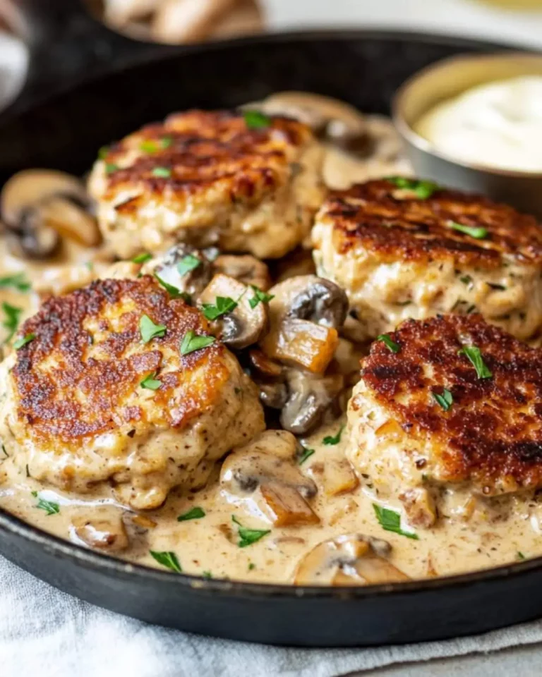 - Doe de kipburgers terug in de pan met de romige champignonsaus en laat ze een minuut of twee opwarmen.