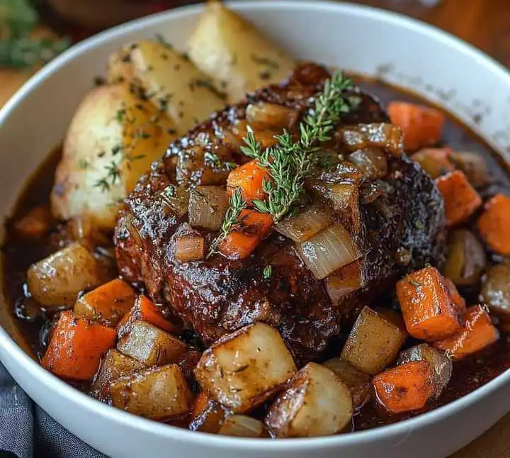 Als chef deel ik vandaag een verfijnd recept voor een klassieke chuck roast, langzaam gegaard in rode wijn. Dit gerecht, geïnspireerd door de Franse ‘Boeuf Bourguignon’, transformeert een stevig stuk vlees in een boterzacht gerecht vol diepe smaken.