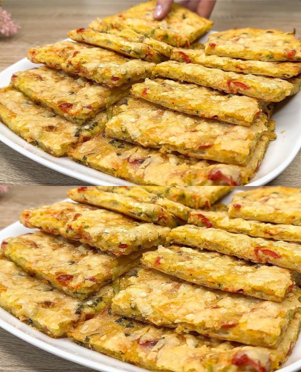 Fodera una teglia, distribuisci uniformemente l’impasto e cuoci in forno preriscaldato a 180°C per 20 minuti. Cospargi la superficie con formaggio grattugiato e continua la cottura per altri 15 minuti finché sarà dorata e croccante.