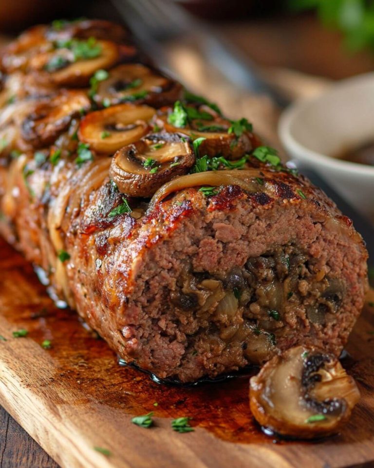 Dit verfijnde gehaktbrood combineert sappig rundvlees met een rijke champignonvulling, een perfecte fusie van klassieke smaken in een modern jasje.
