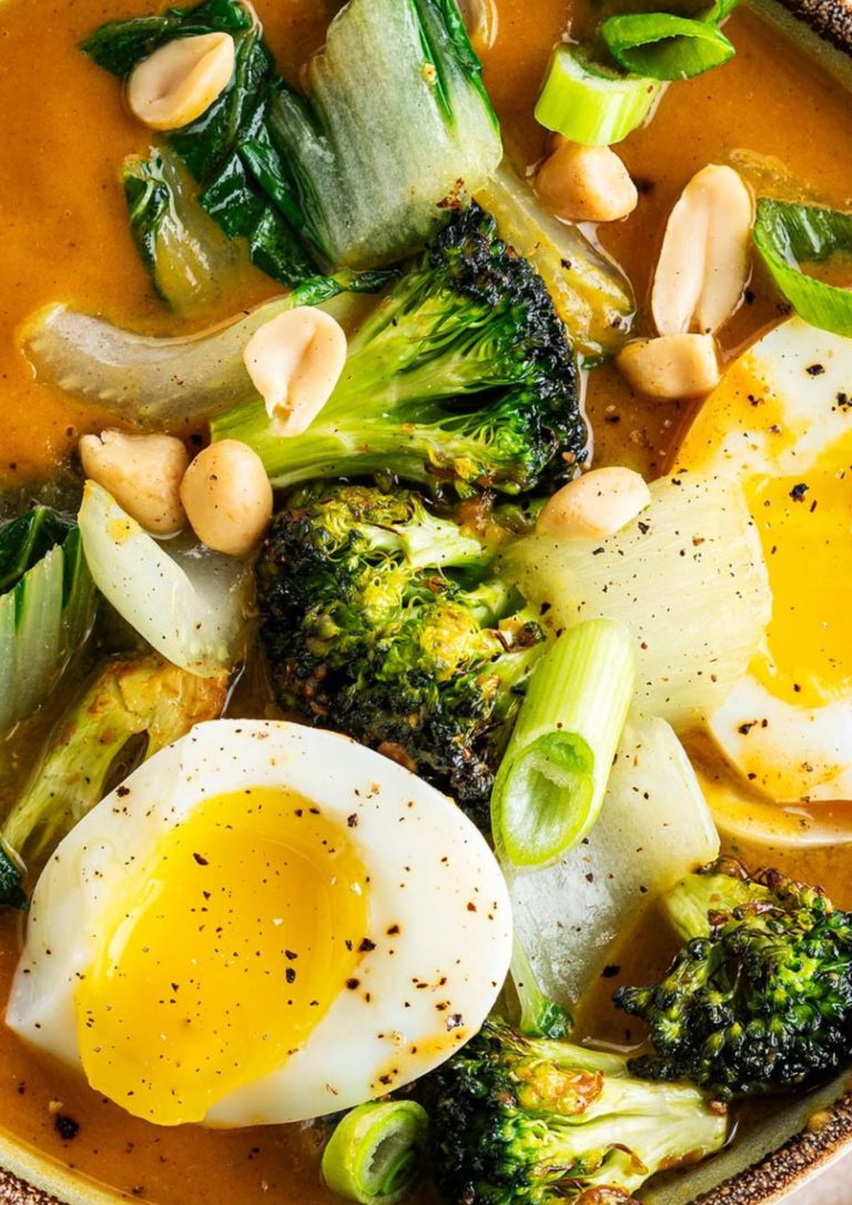 Verdeel de romige soep over diepe kommen. Plaats een halveerd ei in het midden en schik de geroosterde miso-broccoli en paksoi er artistiek omheen. Garneer met de fijngesneden lente-ui en gehakte pindanoten. Serveer direct met het warme naanbrood.