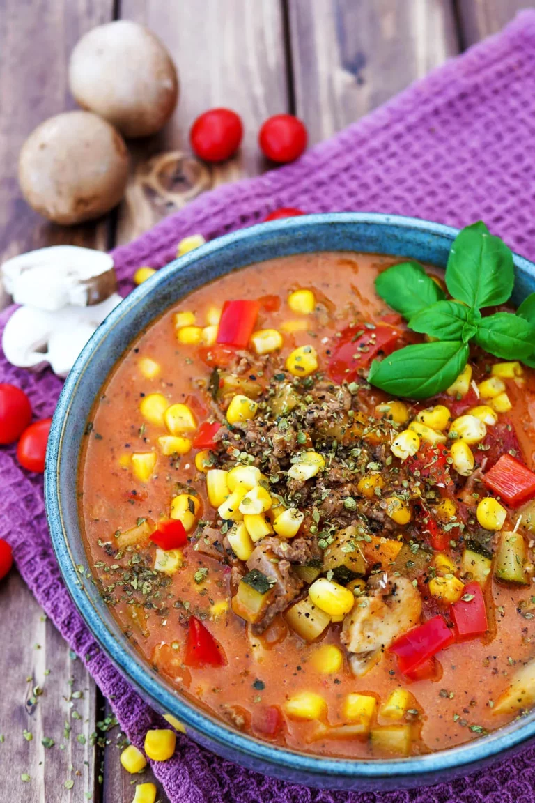 Deze pizzasoep met gehakt biedt een heerlijke en voedzame maaltijd. De tomaten zijn rijk aan vitamine C en antioxidanten, die helpen bij het versterken van het immuunsysteem. Champignons bevatten veel vitamine D, wat goed is voor de botten, terwijl de courgette en paprika boordevol vezels en vitamines zitten, die essentieel zijn voor een gezonde spijsvertering. De maïs voegt een zoetige smaak toe, maar is ook een goede bron van vezels en energie.