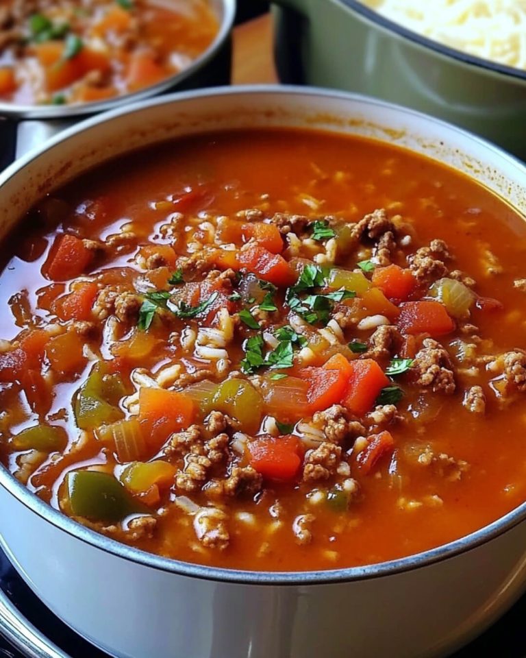 Deze gevulde paprikasoep is perfect voor koude dagen. Vol met smaak en ingrediënten die herinneringen oproepen aan huisgemaakte maaltijden, biedt deze soep een heerlijke combinatie van groenten en vlees.