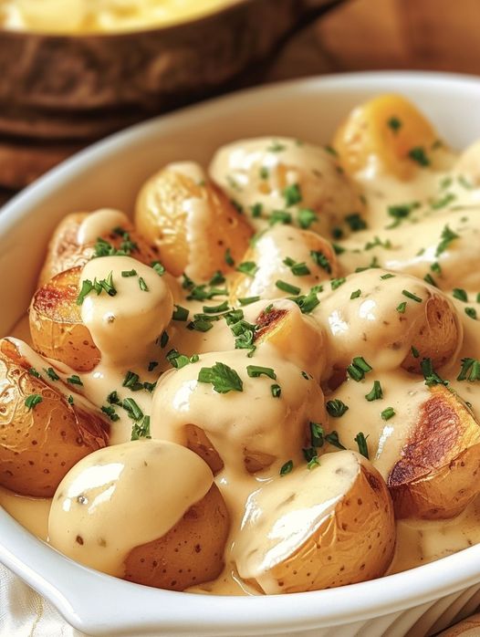 Geniet van je heerlijke romige knoflooksaus baby aardappelen!