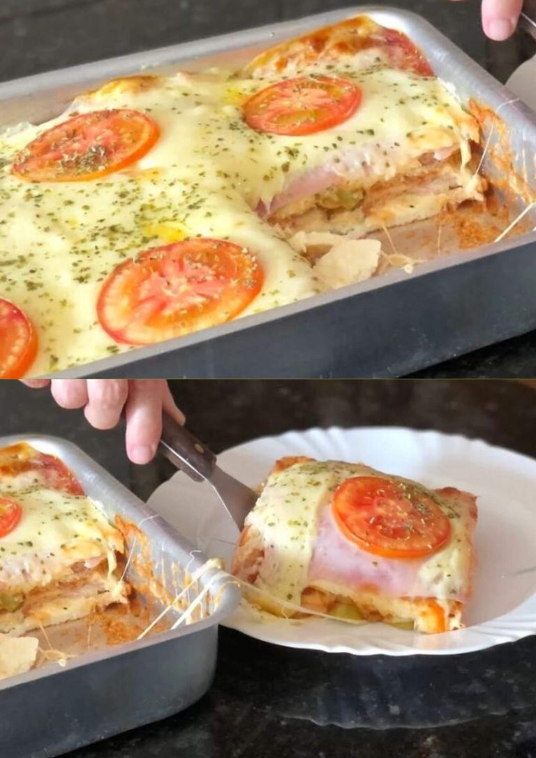 - Layeren: Leg de stukken toastbrood op de bodem van de ovenschaal. Verdeel de plakjes tomaat en mozzarella als een dakpansysteem over het brood. Voeg de gebladerde ham toe bovenop de tomaat en mozzarella.