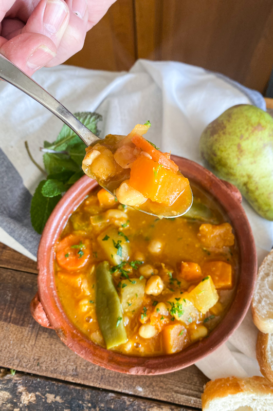 Deze authentieke Spaanse stoofpot, bekend als ‘Olla Gitana’, vindt zijn oorsprong in de rijke zigeunercultuur van Zuid-Spanje. Dit gerecht weerspiegelt de vindingrijkheid van rondtrekkende volkeren die seizoensgebonden ingrediënten combineerden tot een voedzame maaltijd. De unieke combinatie van peulvruchten, groenten en fruit, verrijkt met saffraan en amandelen, maakt dit tot een bijzondere culinaire ervaring.