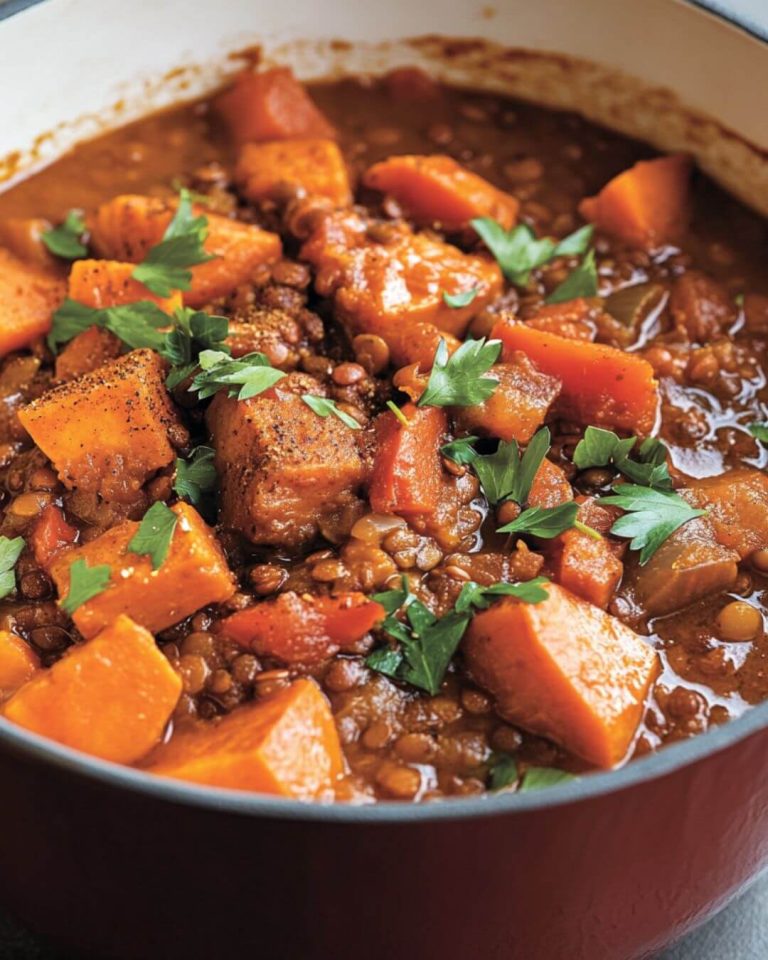 Als chef deel ik vandaag een hartverwarmend recept voor een rijke stoofpot die de aardse smaak van linzen combineert met de zoetheid van zoete aardappel en mediterrane kruiden.